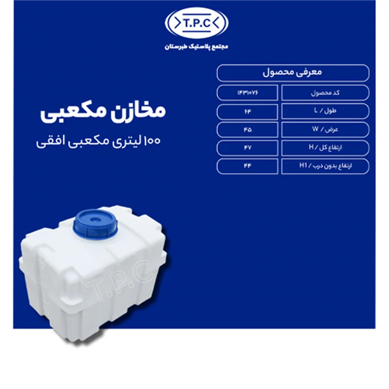 مخزن 100 لیتری مکعبی افقی سه لایه، انتخابی هوشمندانه برای ذخیرهسازی مطمئن و بهینه می باشد. این مخزن با طراحی مدرن و مقاوم در برابر نور خورشید و ضربه، مناسب برای مصارف خانگی و صنعتی است. سه لایه بودن آن تضمین میکند که محتویات بدون تغییر دما و کیفیت باقی بماند.