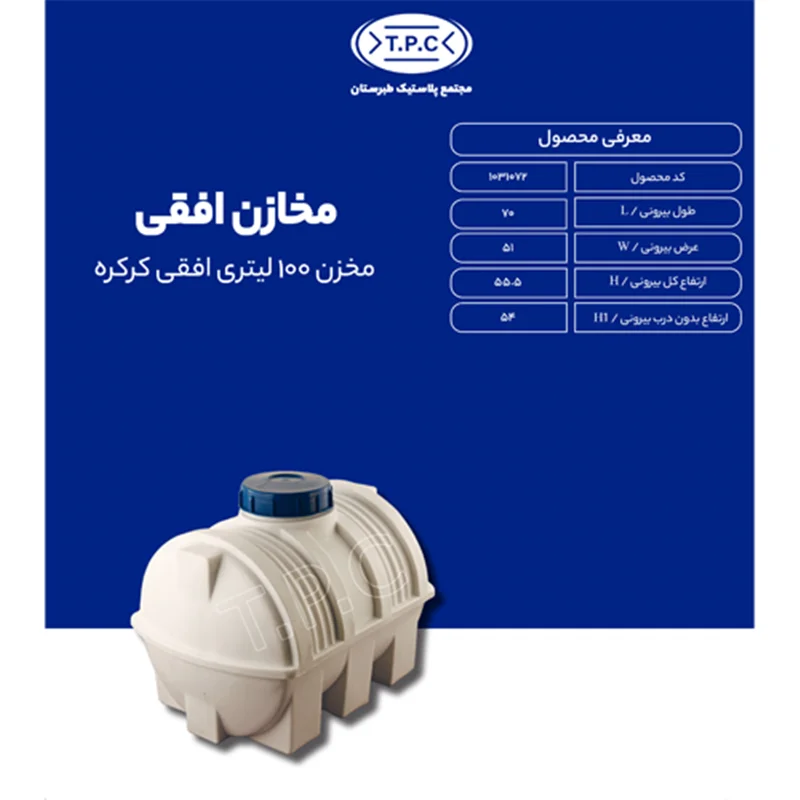با مخزن 100 لیتری افقی کرکرهای سه لایه، نیازهای ذخیرهسازی خود را به بهترین شکل پاسخ دهید. طراحی هوشمندانه و ساخت با کیفیت بالا، این مخزن را برای ذخیرهسازی آب و مواد شیمیایی ایدهآل کرده است. این محصول مقاوم در برابر نور خورشید و ضد نفوذ، انتخابی مطمئن و اقتصادی برای طولانیمدت می باشد.