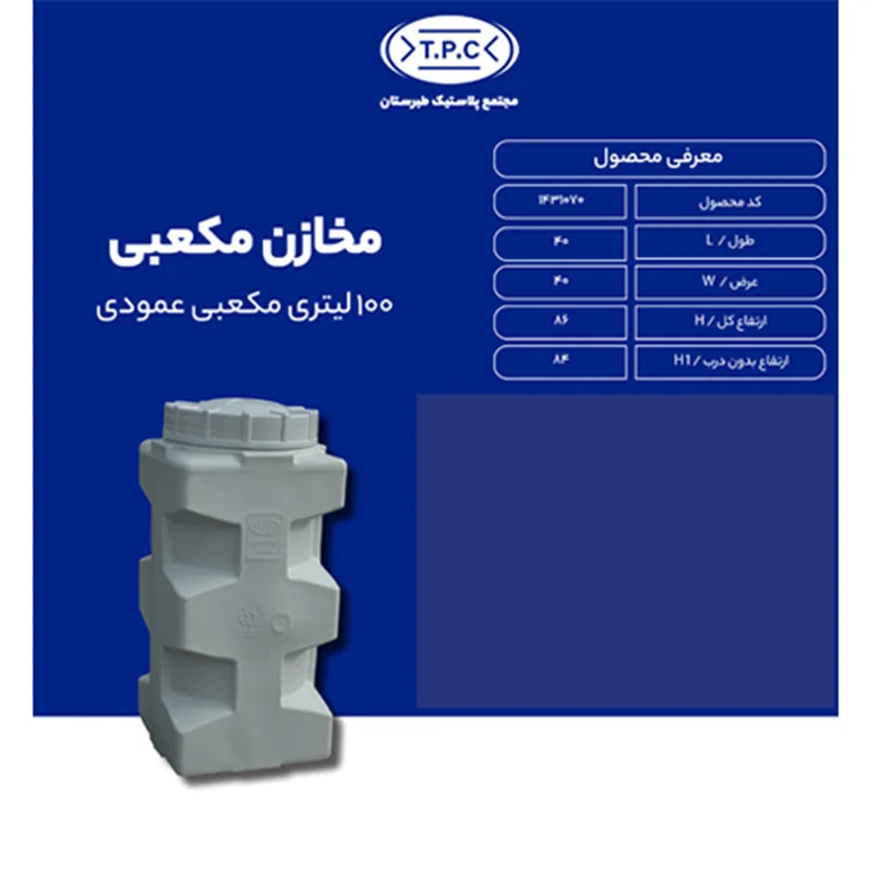 با مخزن 100 لیتری مکعبی عمودی سه لایه، نیازهای ذخیرهسازی خود را به بهترین شکل برآورده کنید. طراحی مدرن و ساختار سه لایه این مخزن، تضمین کننده مقاومت بالا و جلوگیری از نفوذ نور و حرارت است. این مخزن مناسب برای ذخیرهسازی آب و مواد شیمیایی، همچنین ایدهآل برای مصارف صنعتی و خانگی می باشد.