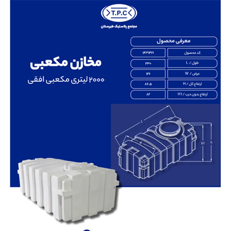 با مخزن 2000 لیتری مکعبی افقی سه لایه، بهترین راهحل ذخیرهسازی آب و مایعات در اختیار شماست. طراحی مکعبی و افقی آن مناسب برای فضاهای محدود است و لایههای مقاوم در برابر نور خورشید و ضربه، طول عمر بالا و کارایی بینظیر را تضمین میکند.
