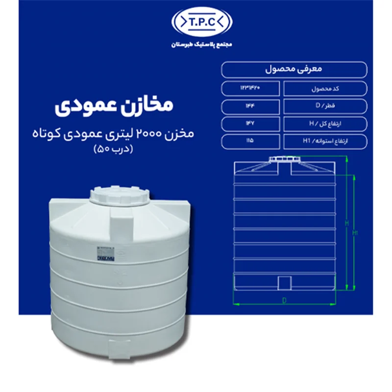 مخزن 2000 لیتری عمودی کوتاه سه لایه، انتخابی ایدهآل برای ذخیرهسازی آب و مایعات میباشد. با طراحی فشرده و مقاومت بالا در برابر نور خورشید و حرارت، این مخزن برای فضاهای محدود عالی است. جنس سه لایه، تضمینکننده کیفیت و دوام است.