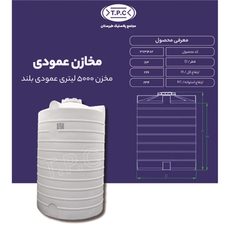با مخزن 5000 لیتری عمودی بلند سه لایه، ذخیرهسازی آب و مایعات دیگر را به سطحی جدید ببرید. این مخزن با طراحی مقاوم به تابش UV، اطمینان از حفاظت محتویات در برابر نور خورشید را فراهم میکند. با ظرفیت بزرگ و دوام بینظیر، انتخابی هوشمندانه برای مصارف خانگی و صنعتی است.