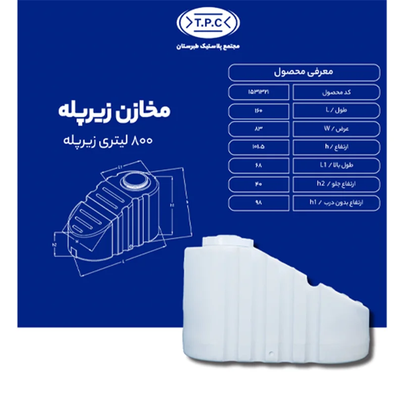مخزن 800 لیتری زیر پلهای سفید، راهکاری هوشمندانه برای ذخیرهسازی آب در فضاهای محدود است. طراحی منحصر به فرد آن، بهرهبرداری از مکانهای کوچک را ساده میکند. با مواد باکیفیت و مقاوم در برابر نور خورشید، این مخزن مناسب ذخیره آب شرب و صنعتی است.